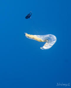 - **Équipement** : Utilise un parachute plus grand conçu pour des descentes contrôlées après un saut en chute libre depuis un avion.